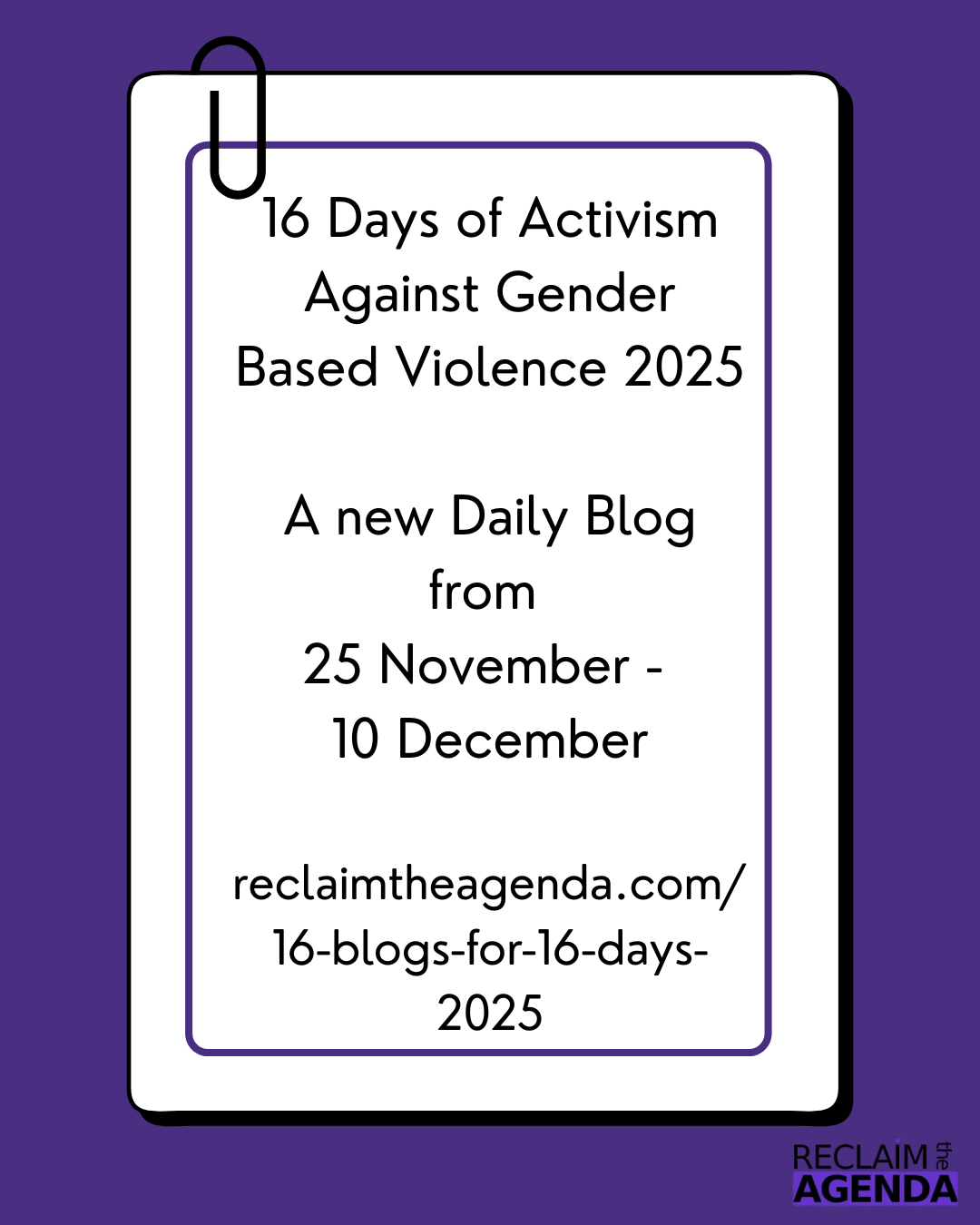 Over the 16 Days Reclaim the Agenda will be sharing Blogs from various organisations and campaigns on different topics relating to Gender Based Violence.