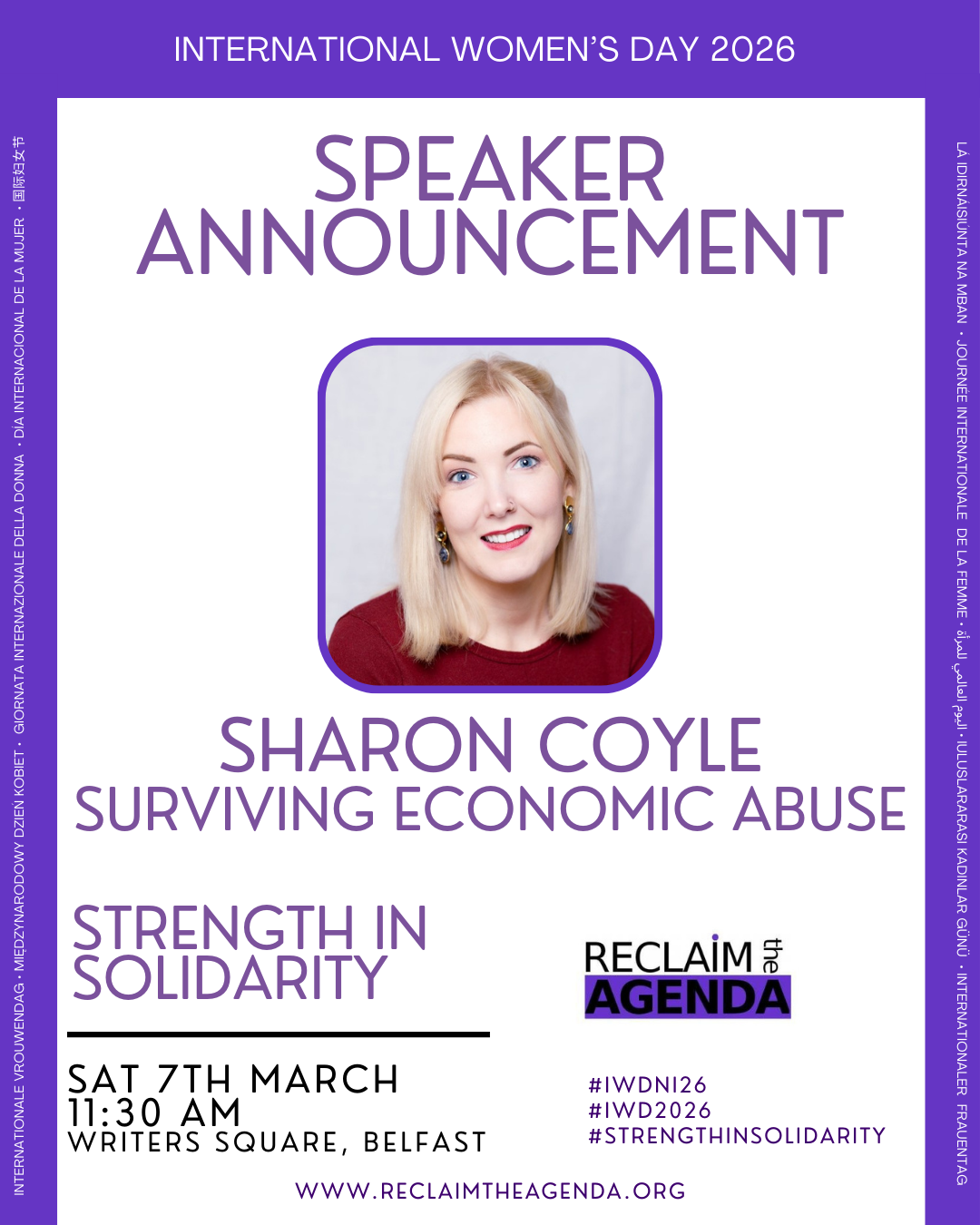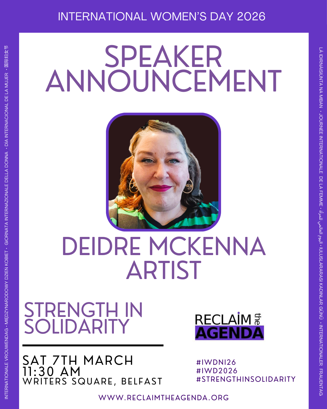 Join us on Saturday 7th March from 10.30 in Writers Square for the big International Women’s Day Rally, to get in the mood, Belfast Film Festival will have the big screen up in the square to entertain us. Our amazing Chidambaram will be leading the rally as we march along Royal Avenue to City Hall for some amazing speeches.